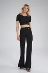 Spodnie dzwony M749 wyposażone są w system praktycznych zapinaczy, co ułatwia ich zakładanie. Szeroki pas zapewnia komfort noszenia przez cały dzień, niezależnie od zaistniałych okoliczności. Ponadto, flared cut stylowo podkreśli Twoje buty, niezależnie od tego, czy są to eleganckie szpilki czy casualowe płaskie obuwie.