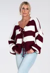 Sweter wiązany z przodu podkreśla modny wygląd. Dzięki ozdobnym troczkom sweter staje się wyjątkowym elementem garderoby.