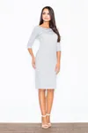 Klasyczny dekolt w łódkę, który znajduje się w sukience M311 Beż, delikatnie podkreśla linię szyi, dodając subtelności całej stylizacji. Dopełnieniem całości są rękawy 3/4, które przez swoją długość pozwalają na akcentowanie nadgarstków, jednocześnie zachowując elegancki charakter ubioru.